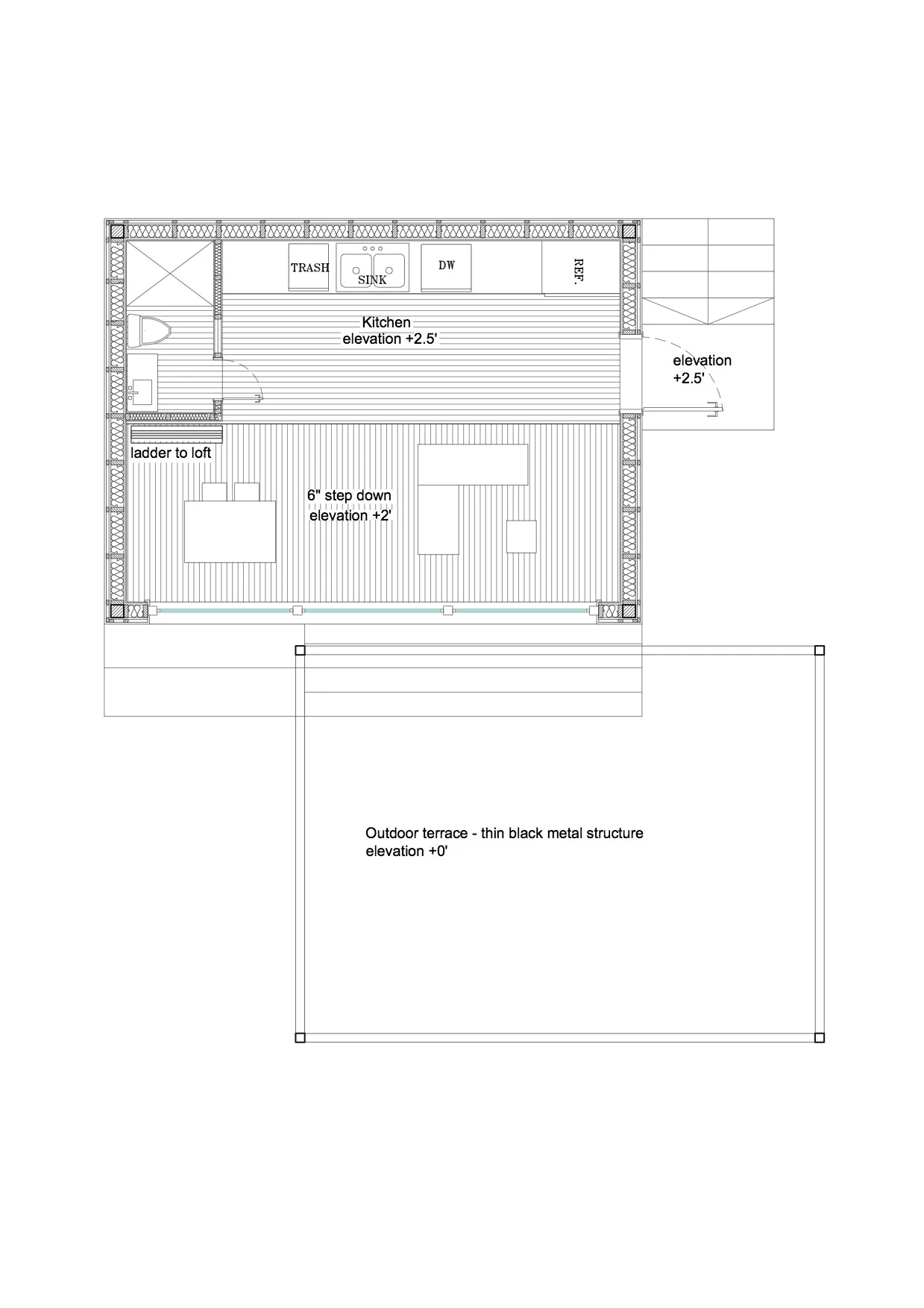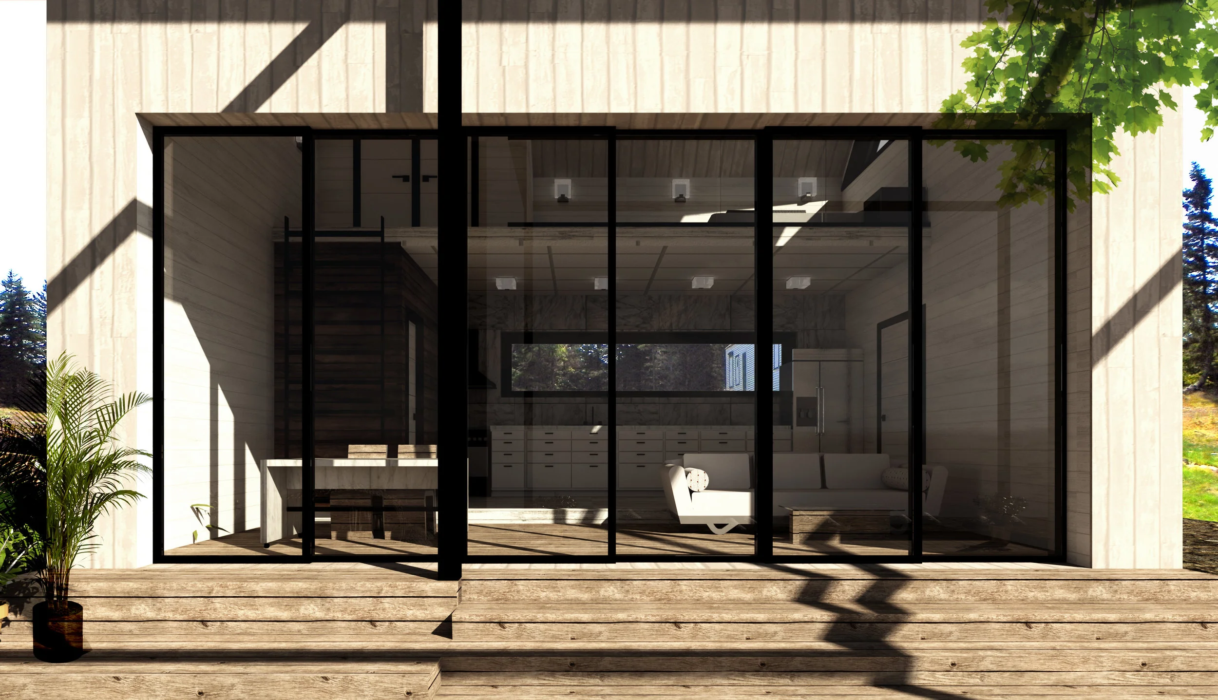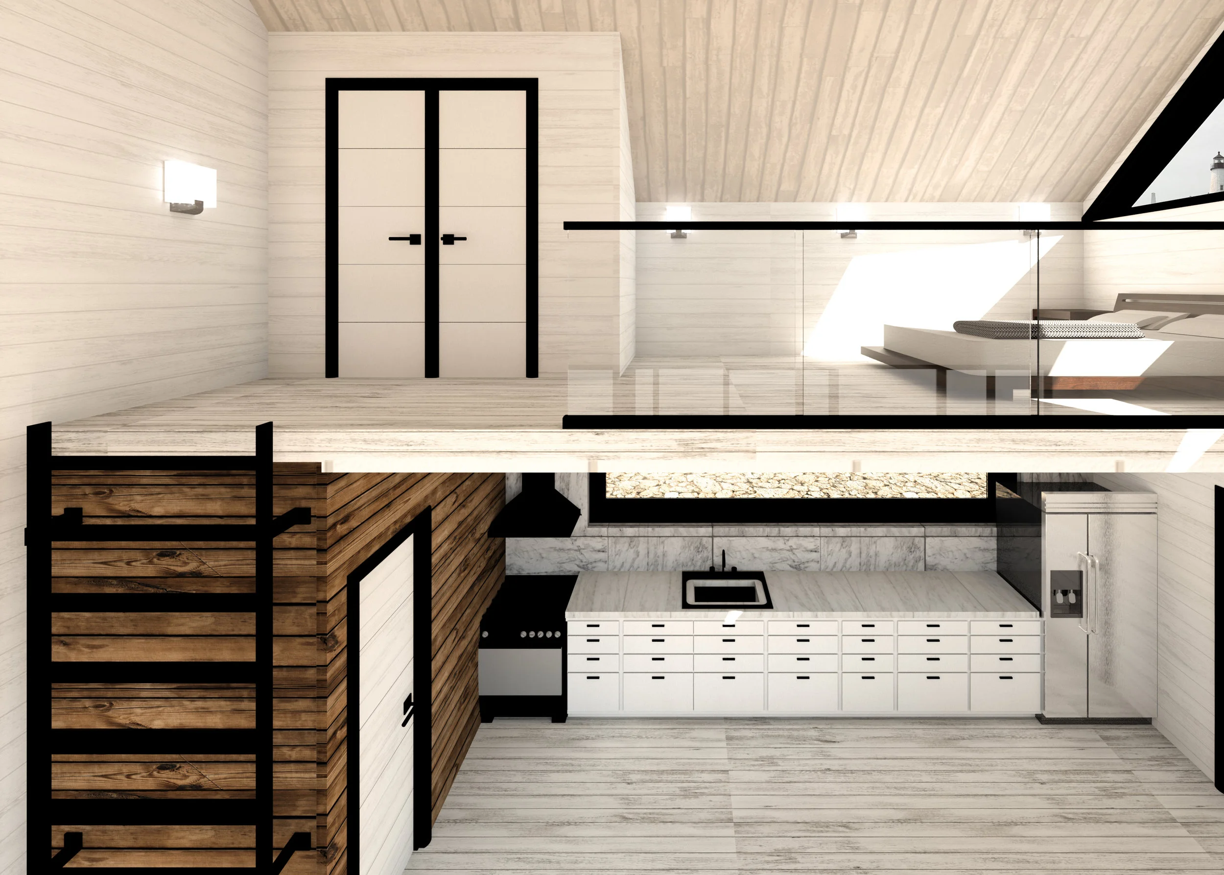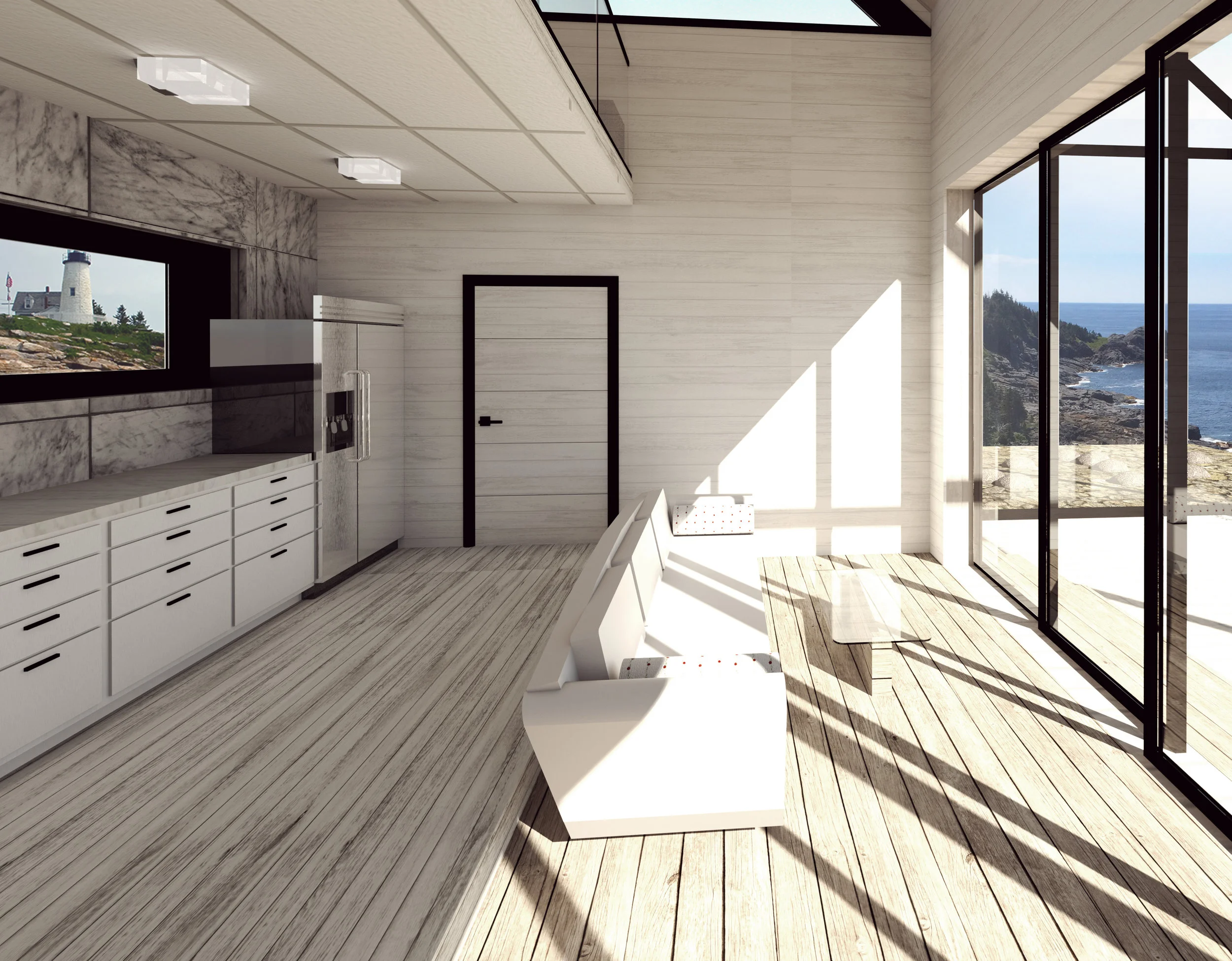 Monhegan Island has a history of being a retreat for artists of all kinds, writers to painters alike. The hills are covered in little picturesque cottages, boathouses, and the occasional light house that serve as the subject matter for much of the art produced there. This cottage is made for the twenty first century artist, visiting the island for inspiration. It is positioned on the property so as to catch the most sunlight through the east and west facade, which are mostly glass. This orientation will allow for maximum heat gain during the winter and cross ventilation during the summer. The cottage itself has a roomy loft space above the working area below. Though the frame is visible black steel for durability in the harsh climate, the facades are all clad in wood to pay homage to the vernacular architecture of the region. Directly adjacent to the cottage is a thin black frame, outlining the skeleton of an “A” frame structure. It is meant to provide a pure, clear space for inspiration while also framing majestic views of the surrounding earth-scape.