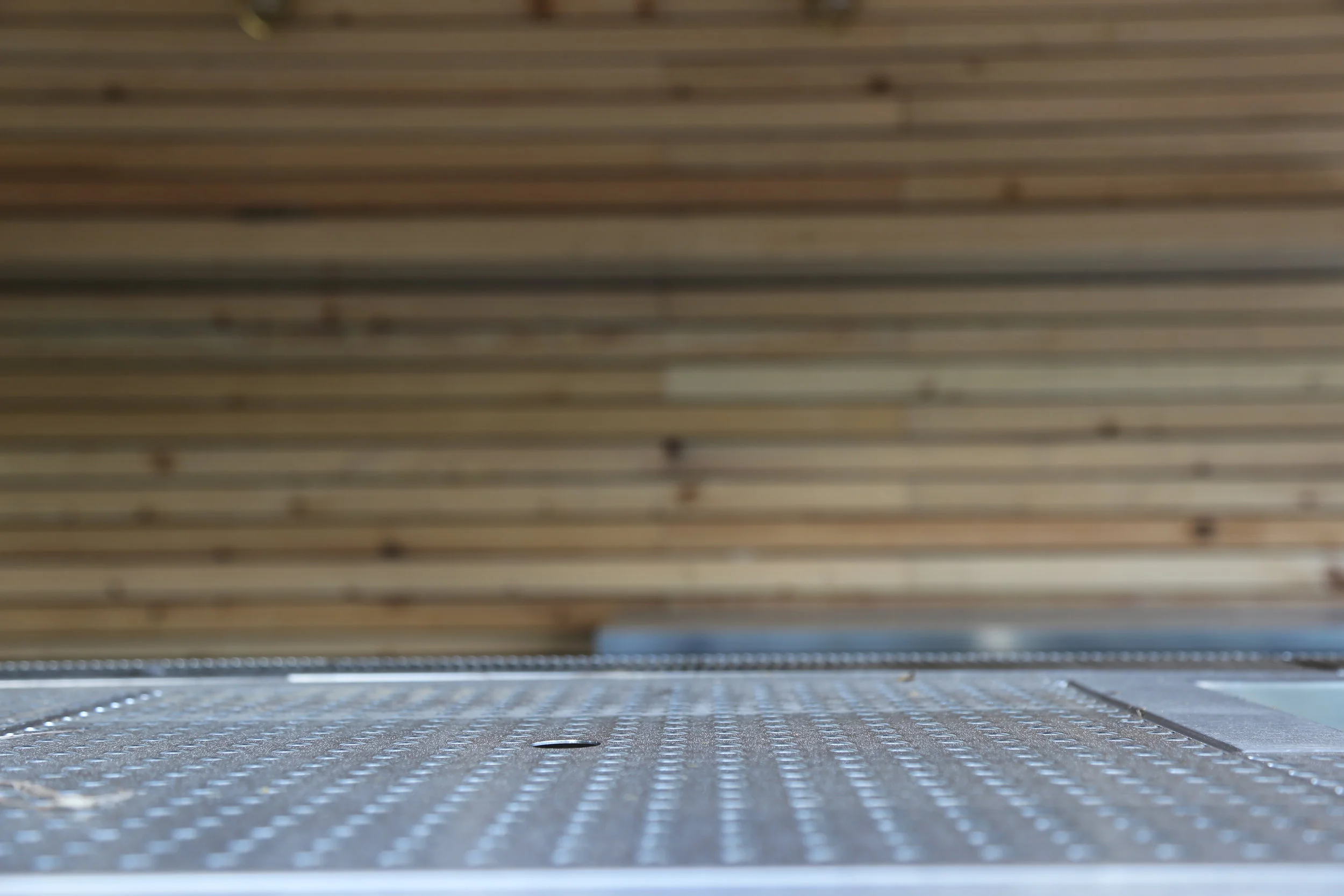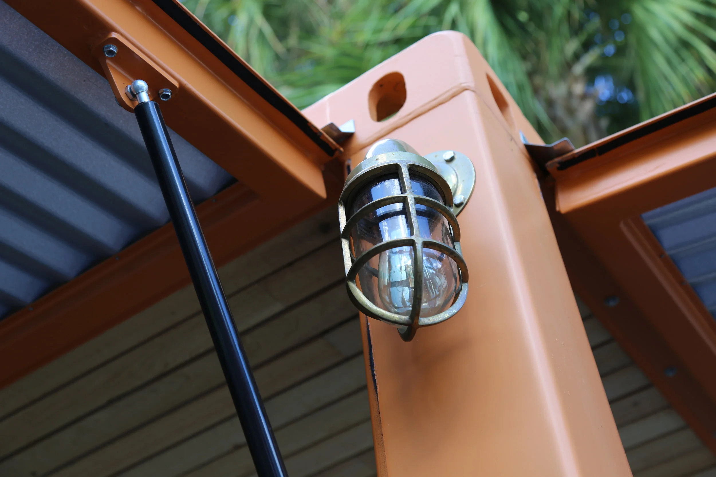 The light fixtures installed on both the exterior and interior of the container are from salvaged retired ships. The rustic horizontal wood siding adds to the nautical theme.