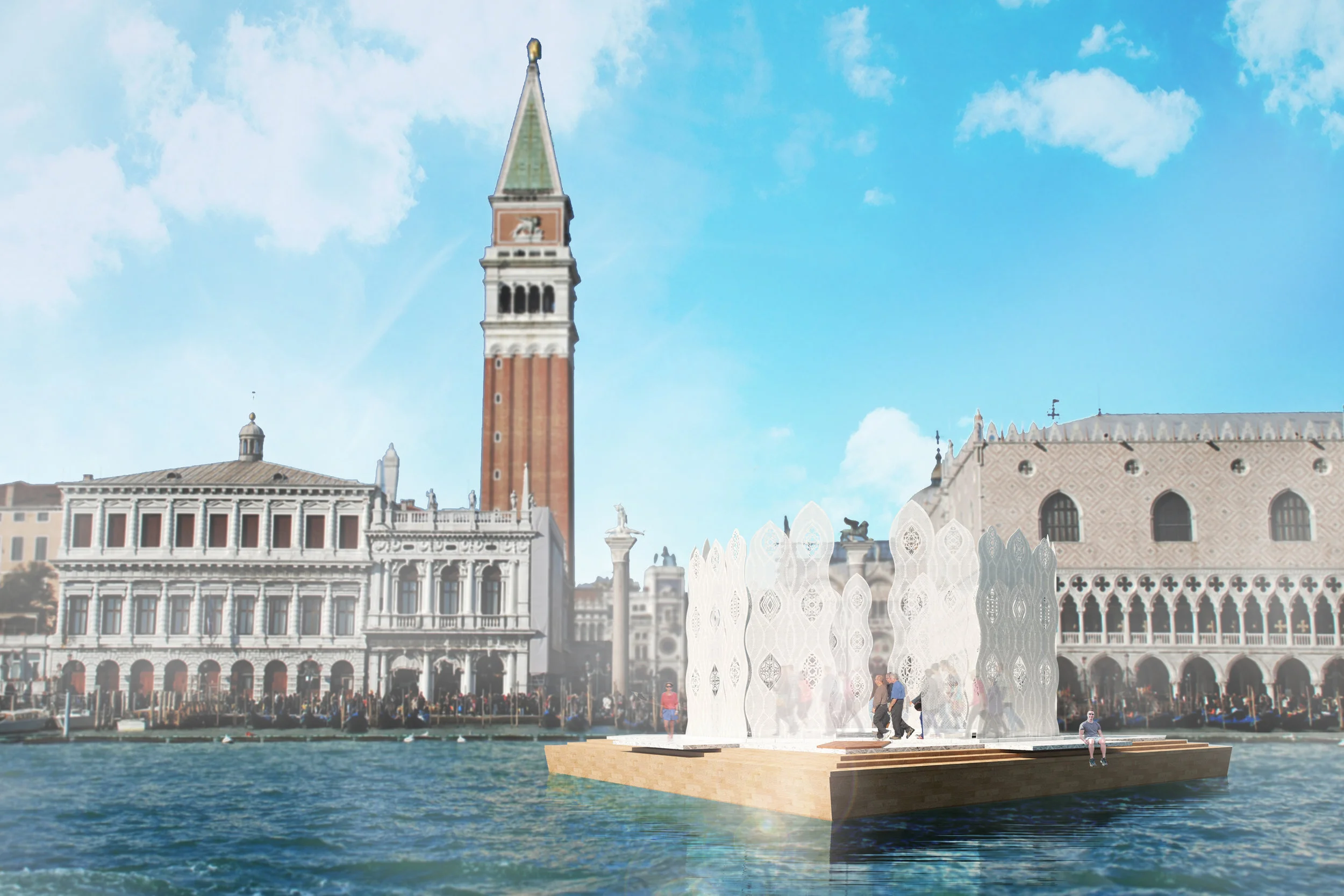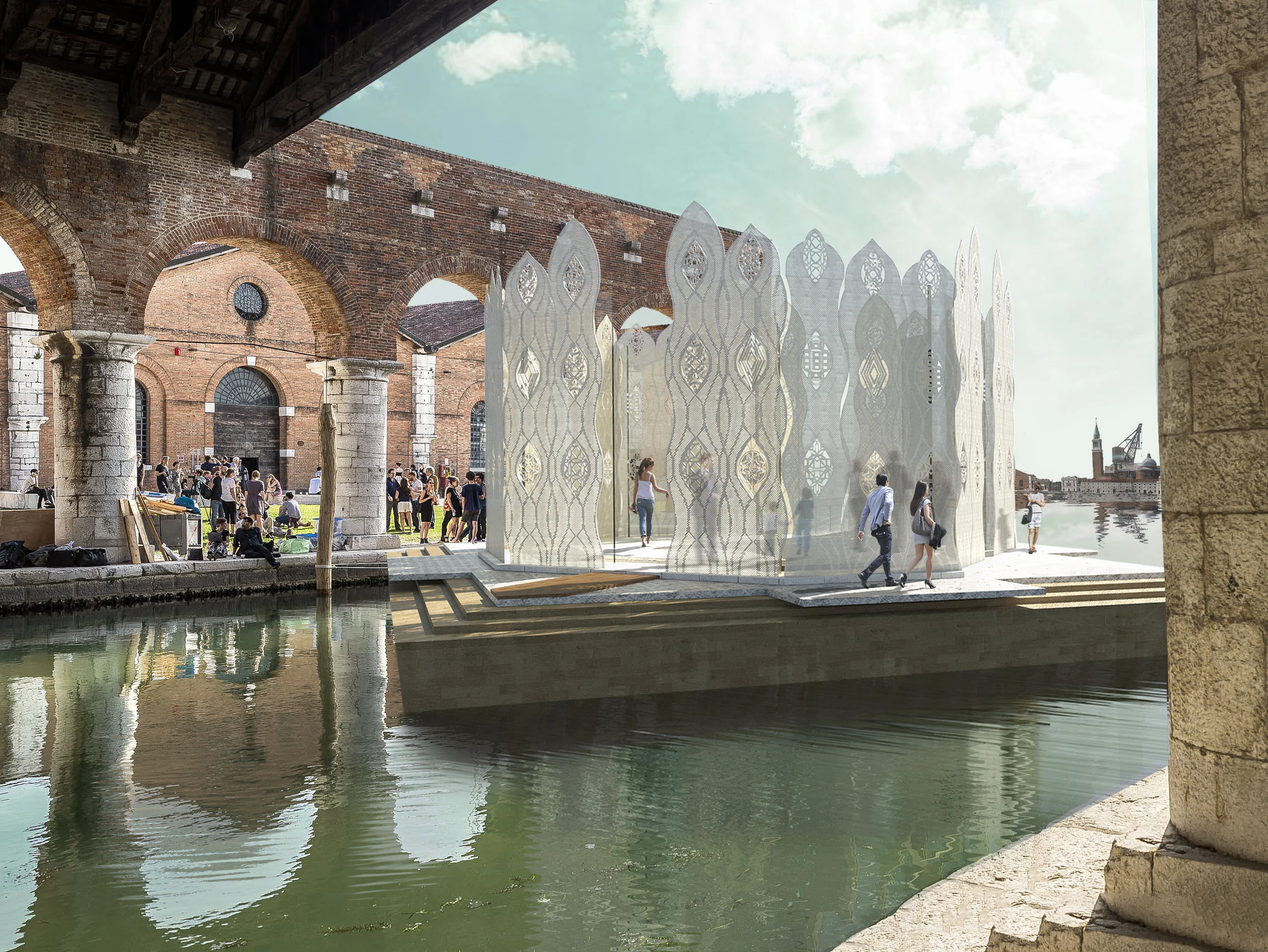 The intricate geometric pattern of the screens beckons imagery of the ornate details on the civic architecture through out Venice, especially the Doge Palace in St. Mark's Square.