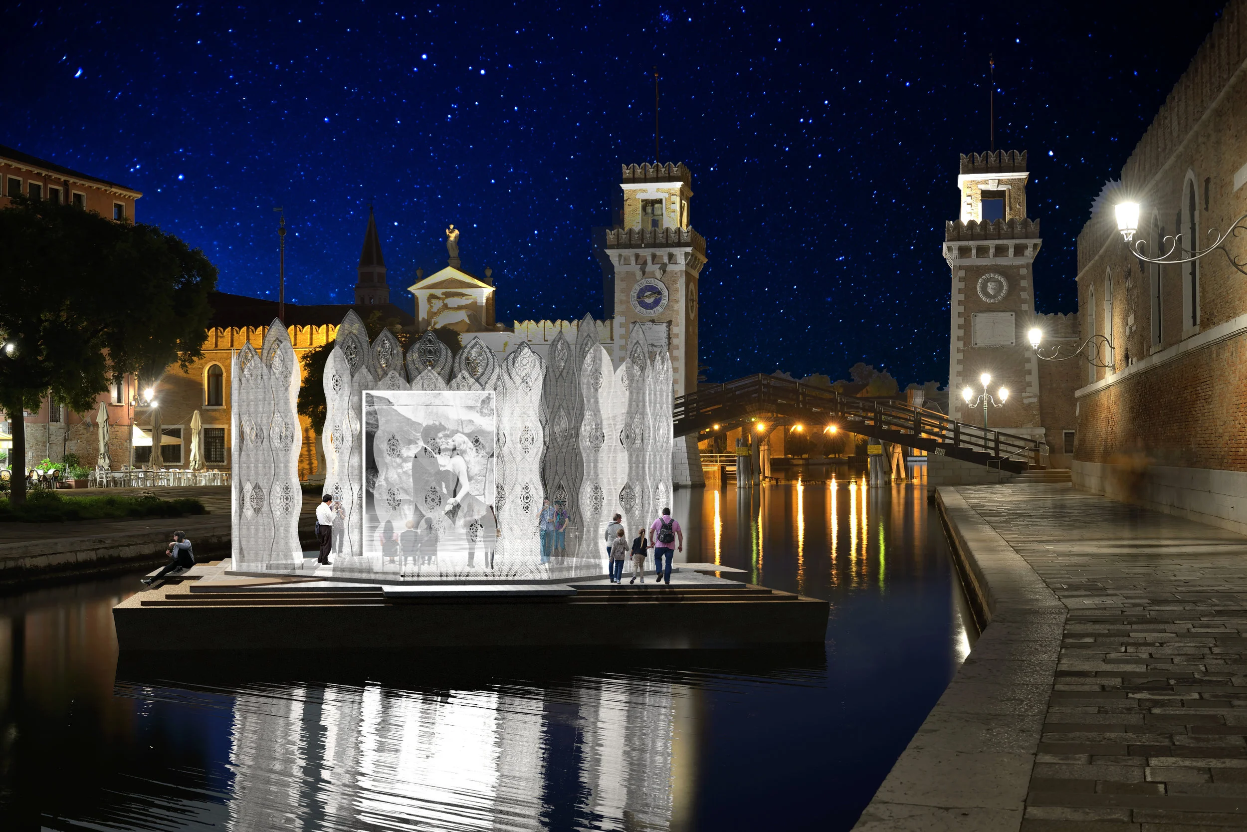 Teatro Burano offers a stark contrast to it's industrial environment. It’s walls are inspired by the delicate venetian lace that made Venice the center of fashion for the courts of Europe in the middle ages. Its intricate mold serves as the perfect translucent skin for this floating theater design.