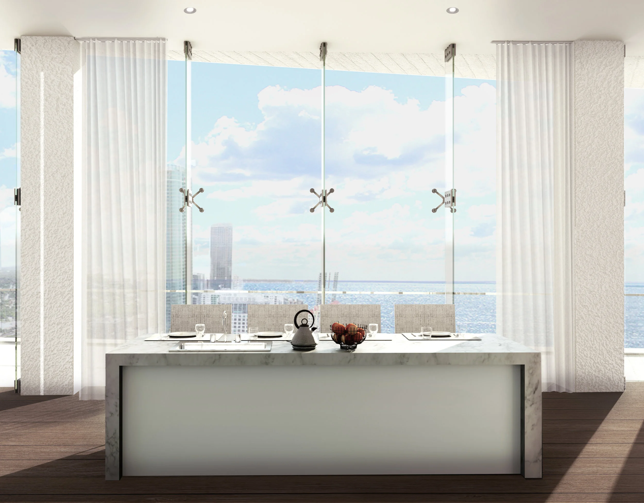 The first phase consists of two sister towers rising 20 stories above the clear waters of Biscayne Bay. Vista in the Grove is designed to redefine the residential experience on Bayshore Drive. The iconic towers curve in order to boast full views of the Atlantic Ocean and provide large, luxurious, and flexible floor plans. A raised urban porch speaks to the growing potential in pedestrian activity. A few steps above street level is a liner of inviting storefronts - which along with residential foot traffic traffic - will activate the base of the building.