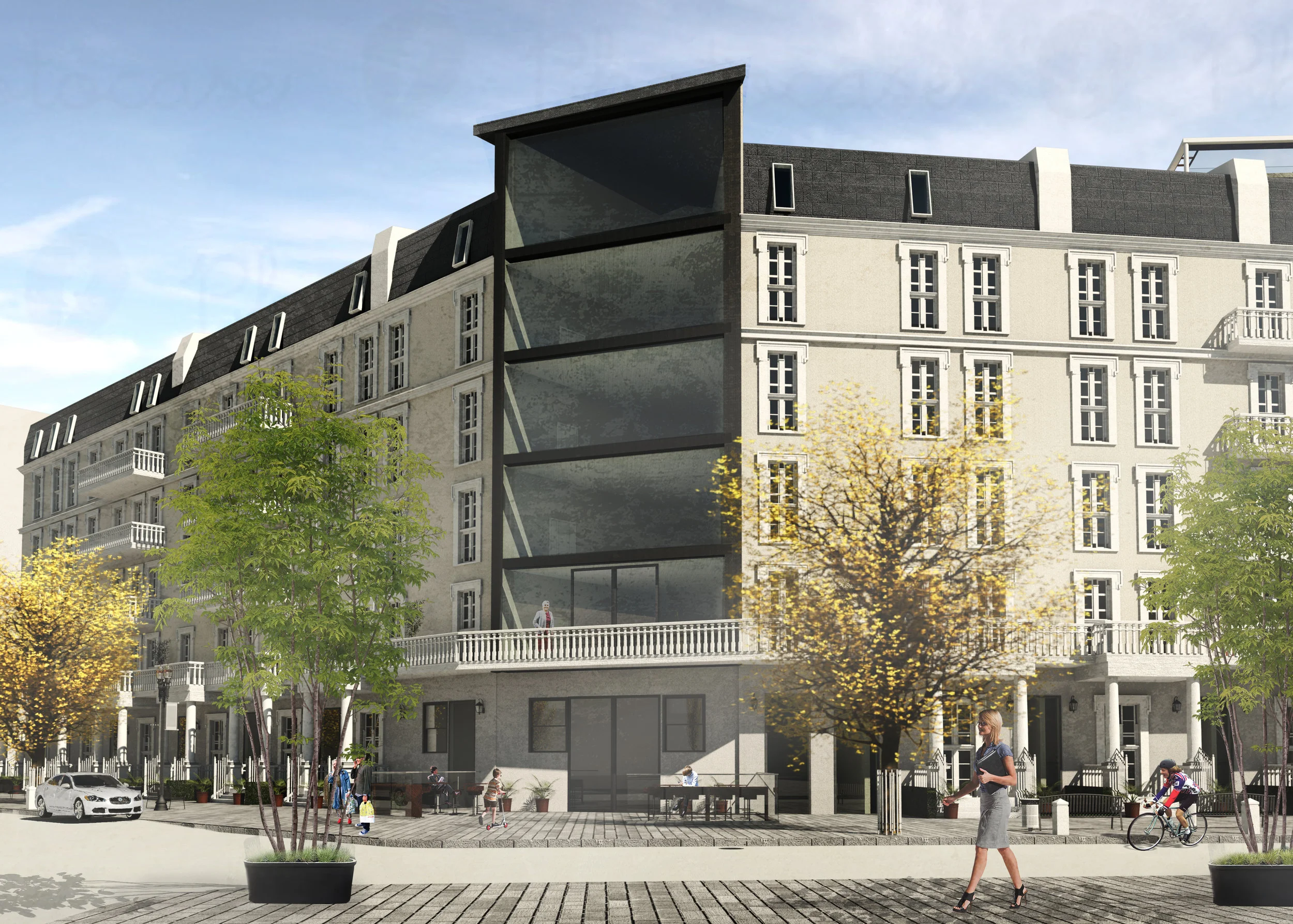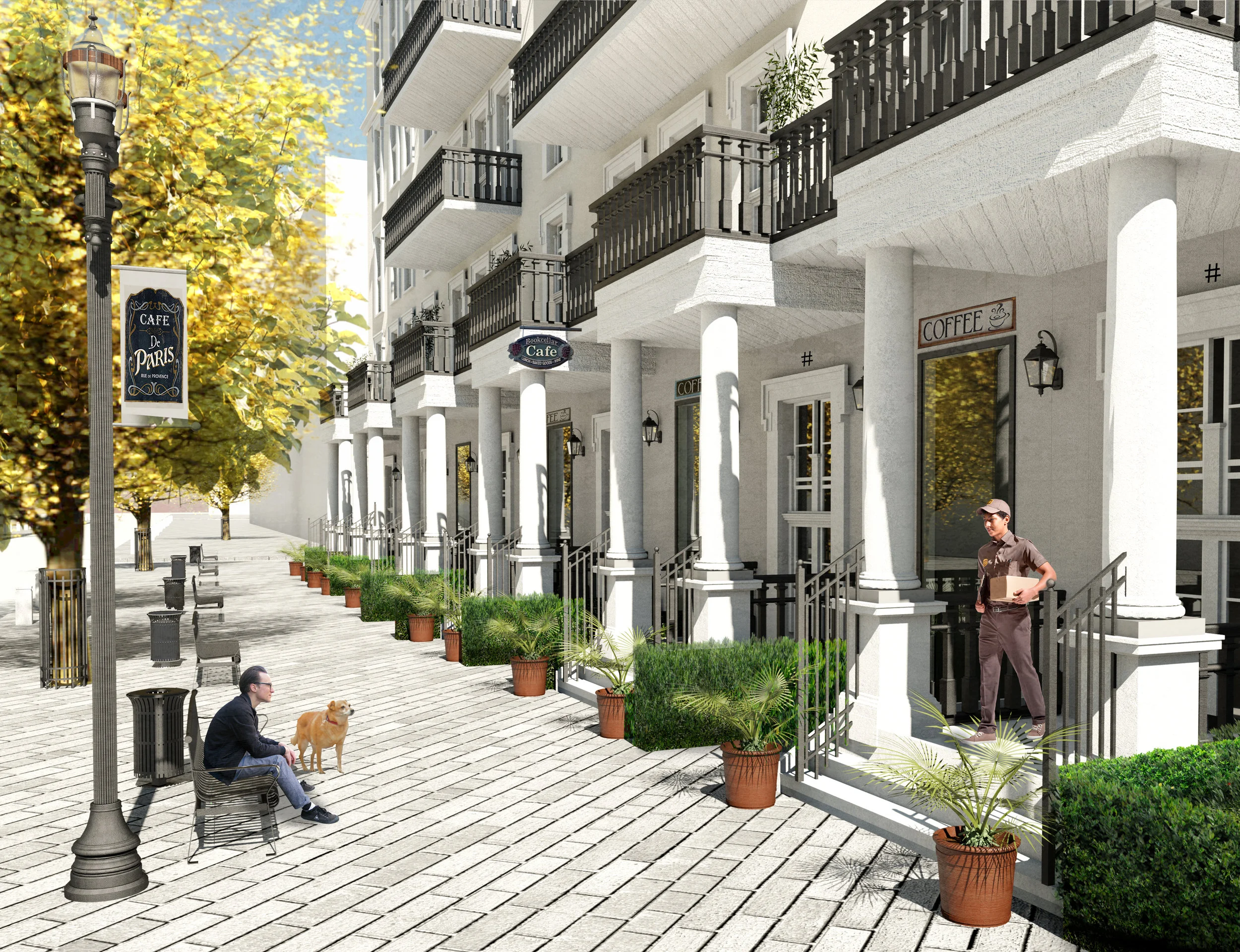 The design of the building is made to create a much more intimate street setting, and provide the structure for a prominent pedestrian avenue. Traditional components are juxtaposed by high contrasting colors. White and black serve as a backdrop to the luscious landscape of the neighborhood.